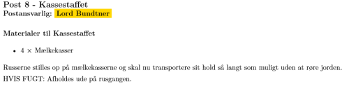 {\large \textbf{Post 8 - Kassestaffet}} \\ \textbf{Postansvarlig:} \LORD \\ \begin{mats}{Lørdag}{Kassestaffet} \mat{4}{Mælkekasser} \end{mats} Russerne stilles op på mælkekasserne og skal nu transportere sit hold så langt som muligt uden at røre jorden.