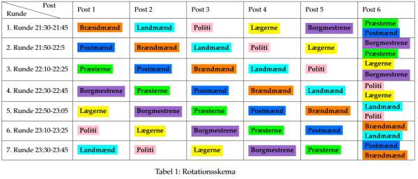 \begin{table}[ht!] \centering\small \begin{tabular}{|l|l|l|l|l|l|l|} \hline \backslashbox{Runde}{Post} & Post 1 & Post 2 & Post 3 & Post 4 & Post 5 & Post 6 \\ \hline 1. Runde 21:30-21:45 & \HPeter & \HJakob & \HTeodora & \HNiels & \HFrida & \makecell[l]{\HMelissa \\ \HLinea} \\ \hline 2. Runde 21:50-22:5 & \HLinea & \HPeter & \HJakob & \HTeodora & \HNiels & \makecell[l]{\HFrida \\ \HMelissa} \\ \hline 3. Runde 22:10-22:25& \HMelissa & \HLinea & \HPeter & \HJakob & \HTeodora & \makecell[l]{\HNiels \\ \HFrida} \\ \hline 4. Runde 22:30-22:45 & \HFrida & \HMelissa & \HLinea & \HPeter & \HJakob & \makecell[l]{\HTeodora \\ \HNiels} \\ \hline 5. Runde 22:50-23:05 & \HNiels & \HFrida & \HMelissa & \HLinea & \HPeter & \makecell[l]{\HJakob \\ \HTeodora} \\ \hline 6. Runde 23:10-23:25&\HTeodora & \HNiels & \HFrida & \HMelissa & \HLinea & \makecell[l]{\HPeter\\ \HJakob}\\ \hline 7. Runde 23:30-23:45&\HJakob & \HTeodora & \HNiels & \HFrida & \HMelissa & \makecell[l]{\HLinea \\\HPeter}\\ \hline 8. Runde 23:55-00.15 &\textbf{ALLE} & \textbf{FAKE}& \textbf{RUSSER} & \textbf{TIL} & \textbf{SPISE} & \textbf{SALEN} \\ \hline \end{tabular} \caption{Rotationsskema} \label{tab:rotationsskema_natloeb} \end{table}