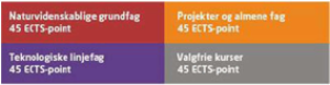 I starten af studieforløbet er der flest fag i gruppen af de Naturvidenskabelige grundfag. Løbende falder antallet af Naturvidenskabelige grundfag, mens der bliver en større og større grad af Valgfrie fag. Projekter og almene fag fylder meget både i starten og slutningen af studieforløbet, mens de Teknologiske linjefag generelt fylder meget i midten af studiet.